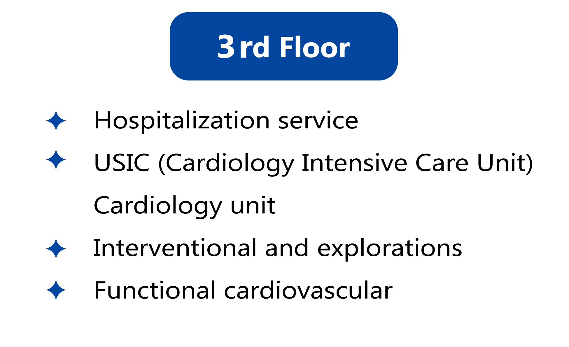 Le troisième étage est dédié aux soins spécialisés en cardiologie. Il regroupe :